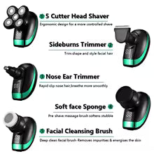 🔄 5-in-1: shaver, trimmer, nose/ear groomer, clipper, facial brush